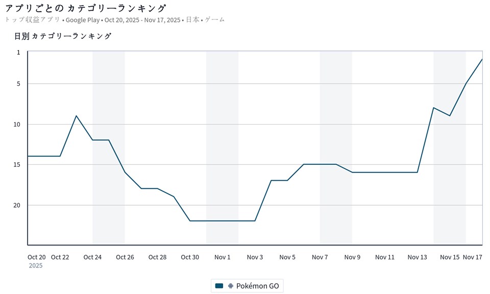 続く2位にはNianticとポケモンの『ポケモンGO』が浮上してきた。『ポケモンGO』は、本日11月18日より「ハイボルテージ」イベントを開催しており、首位を走る『ウマ娘』をとらえることができるのか注目されるところだ。