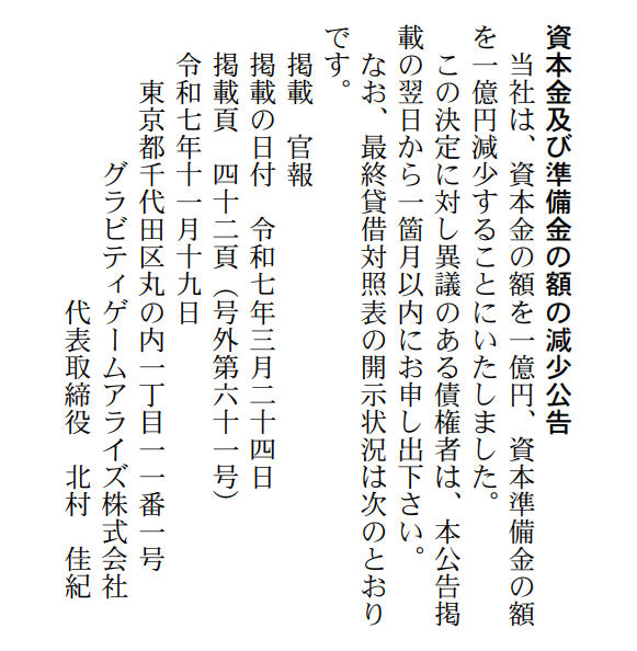 グラビティゲームアライズが減資と減準備金を行うことがわかった。本日11月18日付の「官報」に掲載された「資本金及び準備金の額の減少公告」によると、資本金を1億円、準備金を1億円減らすとのこと。