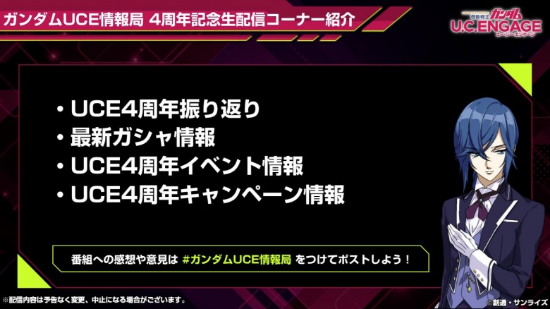 2025年まもなく迎える4周年を記念し、公式生配信番組「U.C.ENGAGEの今がわかる!ガンダムUCE情報局 4周年記念生配信」をYouTubeのガンダムチャンネルにて配信する。