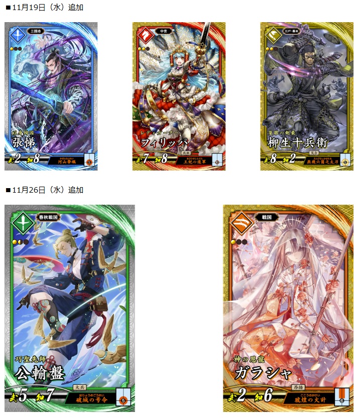 今回の「ココショップ」では11月19日(水)に「R張悌」「SRフィリッパ」「SR柳生十兵衛」、11月26日(水)に「R公輸盤」「SRガラシャ」、12月3日(水)に「R墨子」「SRヒルデガルト」が登場する。