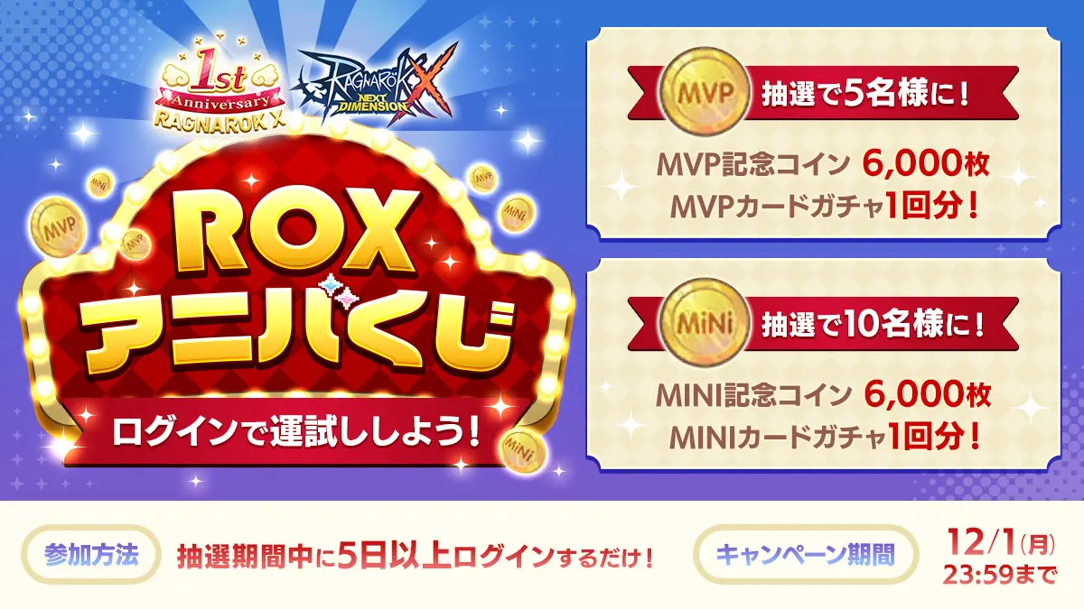 その他、Amazonギフトカード 10,000円分が抽選で5名に当たるXでのリポストキャンペーンや、ゲーム内コインが抽選で当たる「ROXアニバくじ」も実施する。