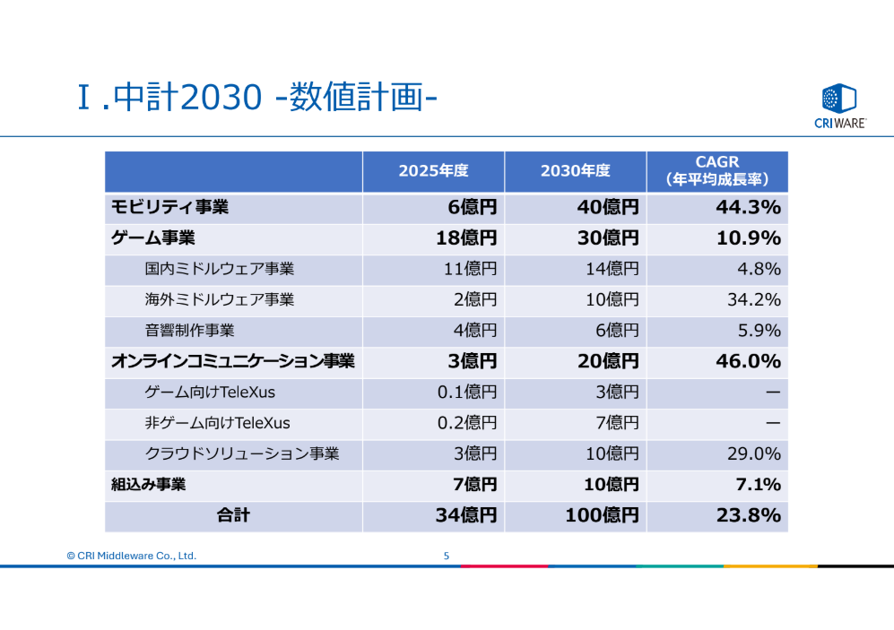 事業別売上高目標(2030年度)は、モビリティ事業が40億円(CAGR 44.3%)、ゲーム事業が30億円(CAGR 10.9%)、オンラインコミュニケーション事業が20億円(CAGR 46.0%)、組込み事業が10億円(CAGR 7.1%)、合計100億円である。