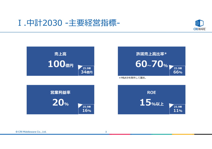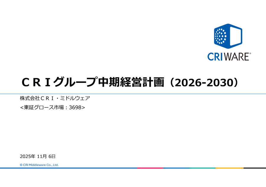 CRI・ミドルウェア<3698>は、2025年11月6日に、2030年度(2030年9月期)に売上高100億円(25年9月期の実績は34億円)、営業利益率20%(同16%)、ROE15%以上(同11%)をめざす「CRIグループ中期経営計画(2026-2030)」(中計2030)を策定した。許諾売上高比率は60〜70%を目標とし、2025年度予想の66%から伸長する。