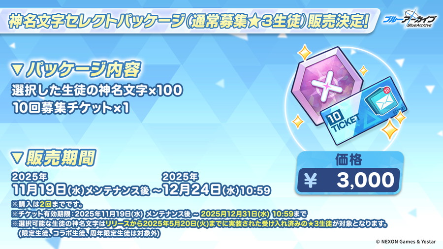 加えて、「アーカイブ募集★3セレクトパッケージ」と「神名文字セレクトパッケージ(通常募集★3生徒)」の新規パッケージ2種が2025年11月19日メンテナンス後より販売される。