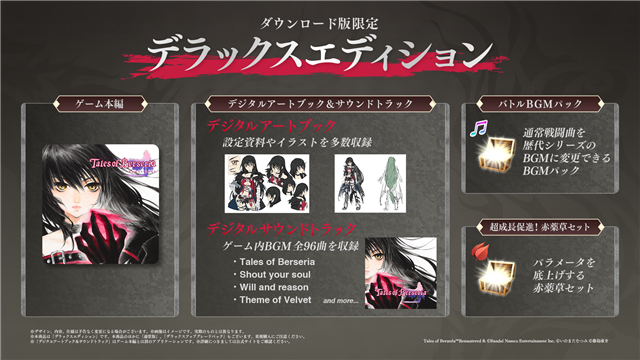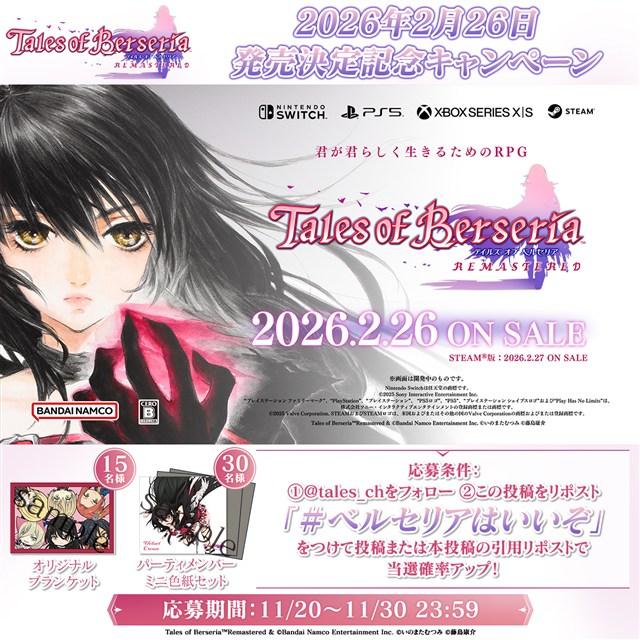 バンダイナムコエンターテインメントは、『テイルズ オブ ベルセリア リマスター』をNintendo Switch/PlayStation5/Xbox Series X|S/STEAMにて、2026年2月26日に発売することを発表した。「アナウンスメントトレーラー」、「オープニングムービー」を公開中。また、製品サイトを公開し、「特装版」を含むパッケージ版、デラックスエディションを含むダウンロード版の予約を開始した。さらに、発売決定SNSキャンペーン情報もお届けする。