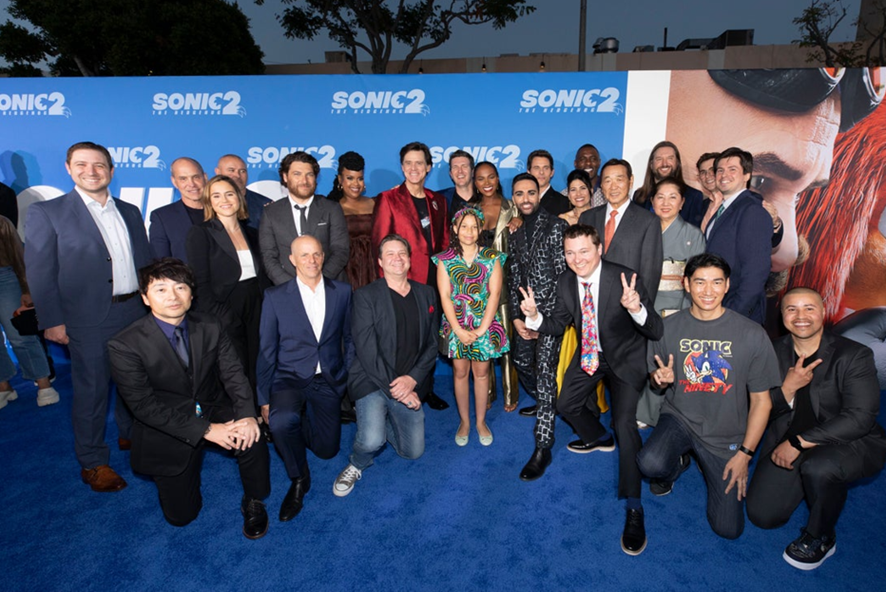 ▲『Sonic the Hedgehog2』のプレミア試写会。前列左端が中原徹氏、右手には本プロジェクトの意思決定者であるセガサミー社の里見治会長、里見治紀社長も。