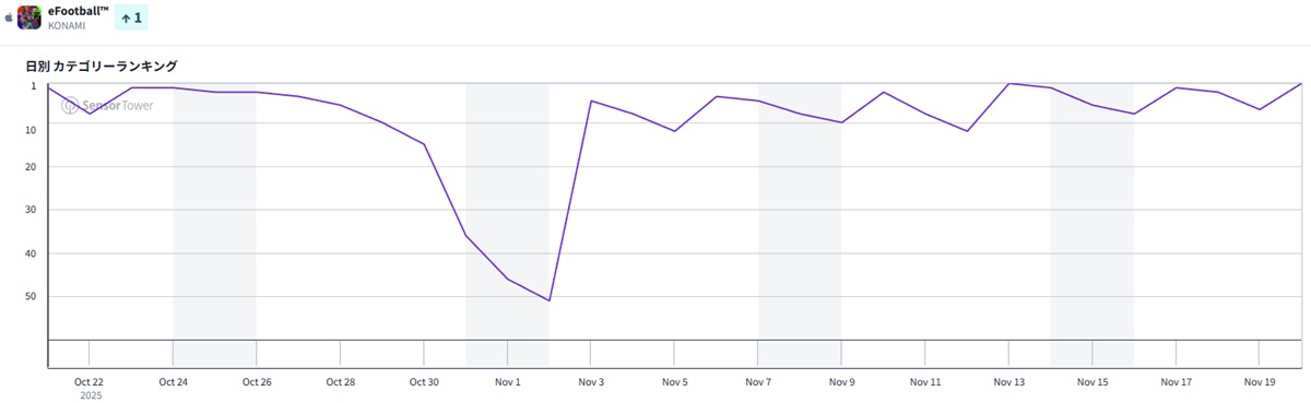 11月21日9時現在のApp Storeセールスランキング(ゲームカテゴリー)は、コナミデジタルエンタテインメントの『eFootball』が前日7位からトップに浮上した。