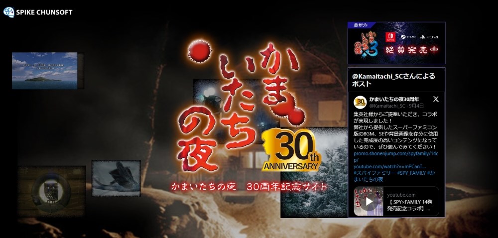 1年前の2024年11月25日は、スパイク・チュンソフトが、サウンドノベル「かまいたちの夜」が、シリーズ1作目の発売から30周年を迎えることを記念して、周年記念の特設サイトを公開することを発表した。