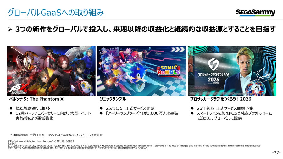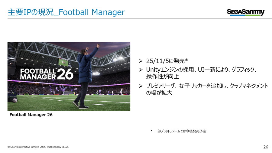 とりわけ『フットボールマネージャー2026』は初速が2024年版比3割増と好調な出足となった。一方でUI刷新による操作性の不満が出ているほか、中国語翻訳の粗さなどにより評価が伸び悩んでいるが、改善対応を順次進めていく考え。『サカつく』の新作とともに26年のワールドカップイヤーを盛り上げたい、としている。