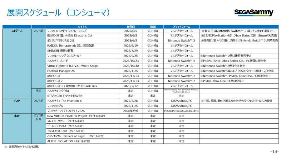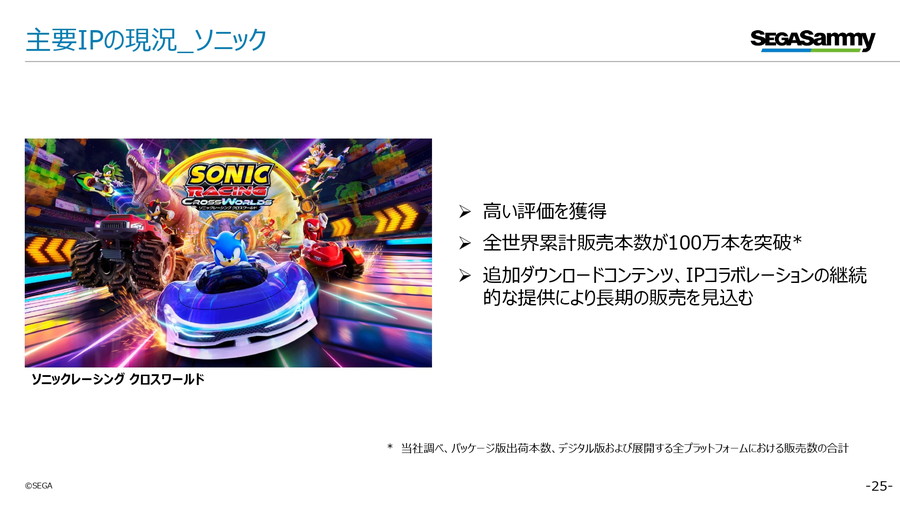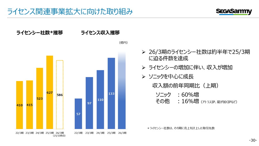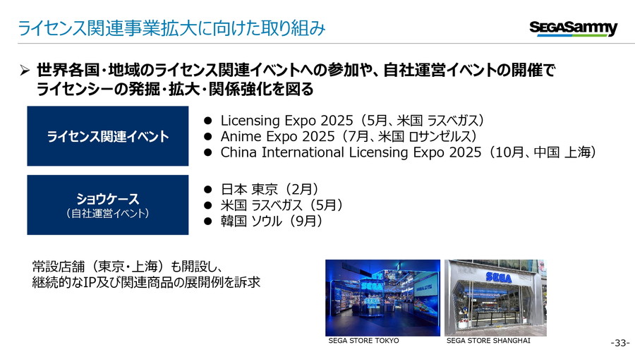 ライセンス提携社数が増加し、グローバルブランドとの協業が順調に拡大した。プーマ、ベアブリック、レゴなどとのコラボを進めるほか、拡大した来世インスのネットワークを活用し、『龍が如く』『ペルソナ』『プロセカ』など他IPの展開も拡大していく考え。渋谷にオープンした「セガストア」は計画の約3倍の月商で推移するなど好調だった。渋谷という立地の良さもあり、インバウンド比率は6割以上だったという。