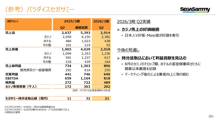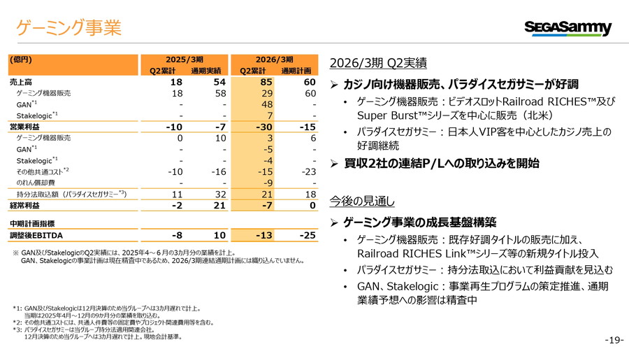 既存のゲーミング機器販売と韓国・パラダイスセガサミーは好調だった。その一方で、買収したGAN(B2B/B2Cオンラインゲーミング)とStakeLogic(オンラインスロット)は、4~6月期決算の取り込みを行ったため、大幅な赤字となった。