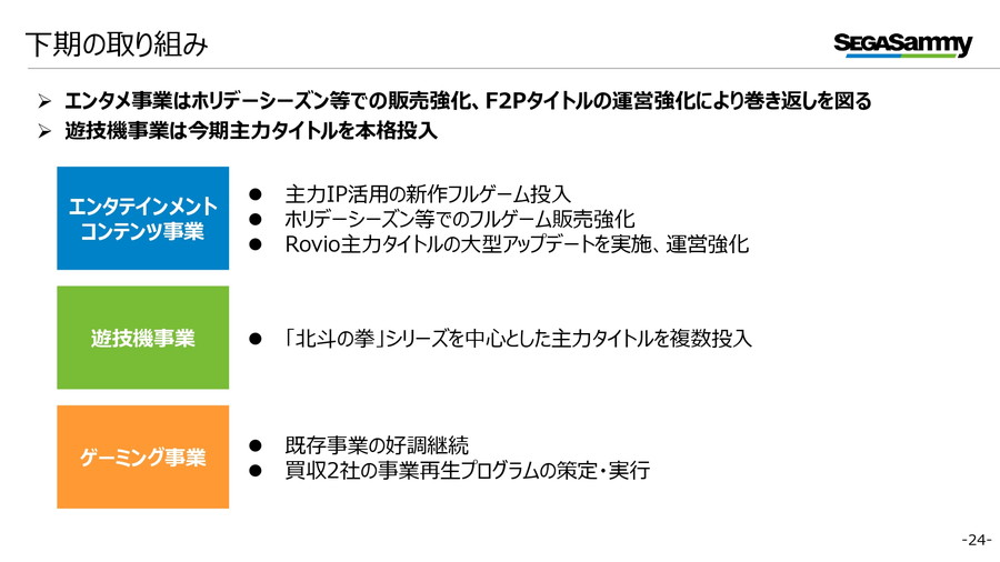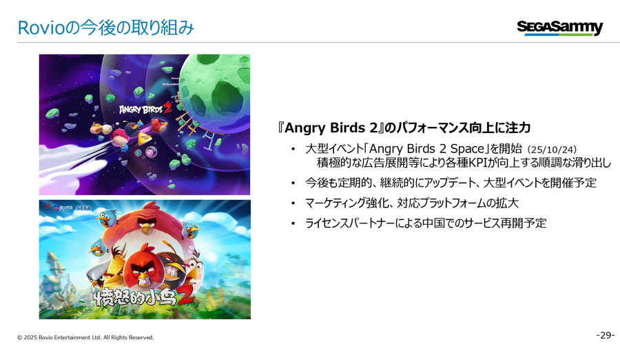 Rovioについては、『アングリーバード2』のアップデート効果が出始めており、『アングリーバードムービー3』のライセンスが来期からセガに移管されることで、トランスメディアでの展開を強化していく考え。さらにIP知名度の高い中国への再参入も視野に入れる。