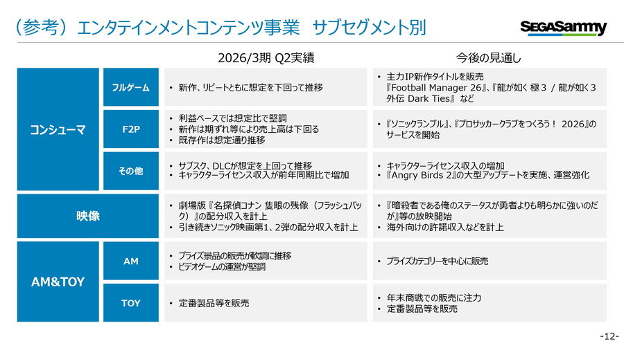 主力タイトルを投入したものの、フルゲーム販売とRovioの業績が想定を下回り、セグメント全体の足を引っ張った。一方、サブスクリプション向けタイトル提供、キャラクターライセンス収入、DLCの販売は良好だったという。映像分野では『名探偵コナン』の配分収入や海外販売が好調だった。
