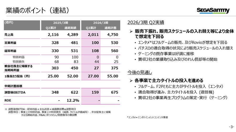 セガサミーホールディングス<6460>は、2026年3月期第2四半期 決算説明会を開催し、上期の連結業績が想定を下回ったことを明らかにした。エンタテインメントコンテンツ事業ではフルゲーム販売とRovioの業績が伸び悩み、遊技機事業ではパチスロの適合取得が遅延した。さらに、ゲーミング領域では、期初計画に織り込んでいなかったGANおよびStakeLogic買収の影響が出た。営業利益ベースでは上期計画を40億円程度下回り、調整後EBITDAも計画比で159億円の未達となった。中間配当はDOE3%基準に基づき27円とした。