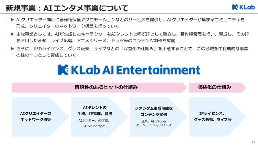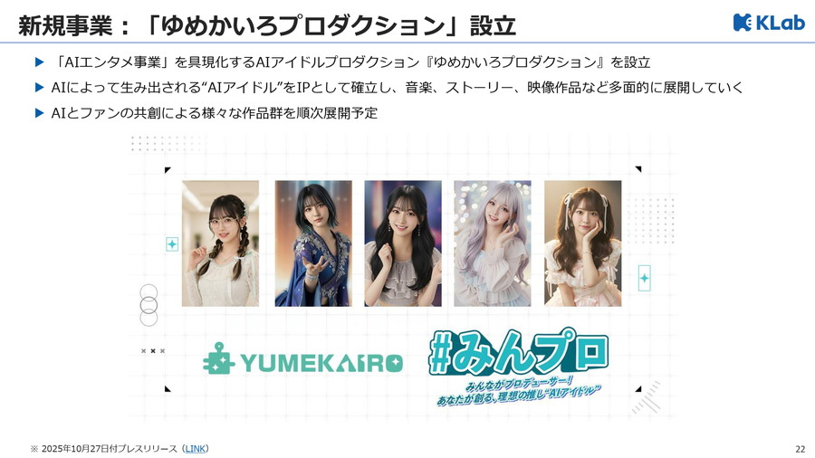 同社はAIクリエイター向けサービスを中心に、著作権保護やプロモーション支援、コミュニティ形成などを行う「総合AIエンタメ事業」を推進する。AI生成キャラクターを“AIタレント"としてIP化し、音楽・ライブ配信・アニメ・ドラマなど多媒体展開を進める。この構想を具現化するため、AIアイドルプロダクション「ゆめかいろプロダクション」を設立。AIとファンが共創する作品群を順次公開し、中長期的にKLabの新たな柱とする。
