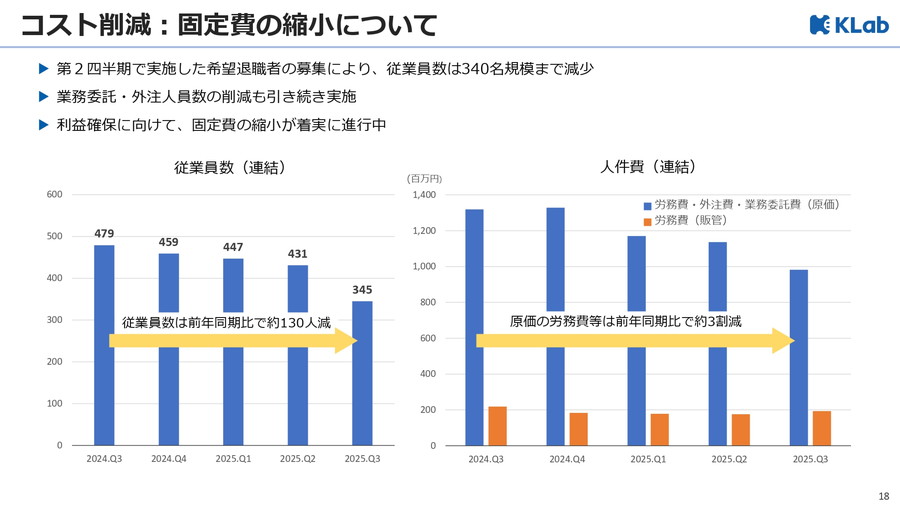 また、第2四半期に実施した希望退職により従業員数は340名規模まで縮小した。派遣や業務委託など外注人員の縮小も継続してコスト構造の見直しを進め、「利益確保に向けた固定費削減は計画通り進行している」とした。