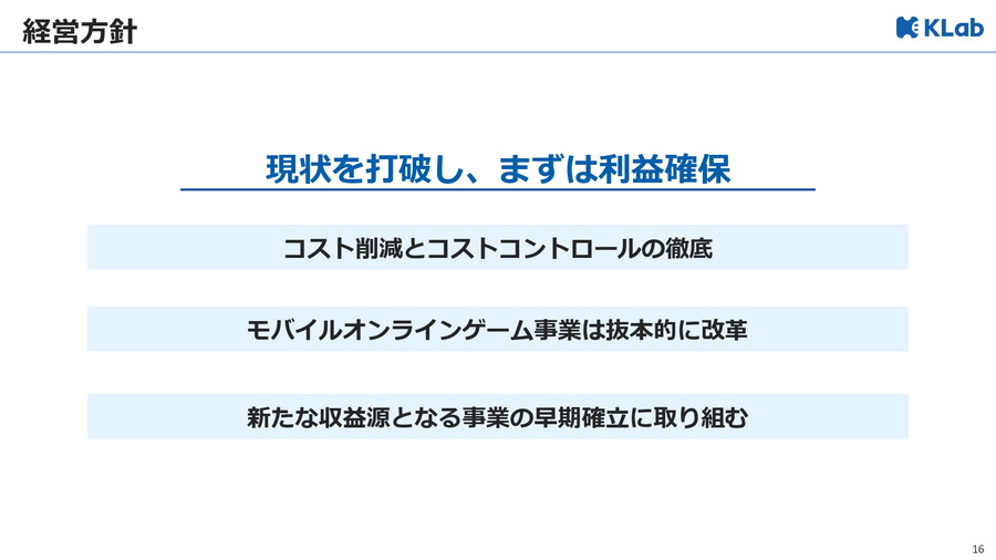 KLab<3656>代表取締役社長 真田 哲弥氏は、第3四半期の決算説明会において、今後の経営方針として「現状打破と利益確保」を最優先課題に掲げ、大規模な固定費削減とモバイルオンラインゲーム事業の抜本改革、新規収益源の早期確立に取り組む方針を示した。足元で実施している具体的な施策についても説明した。