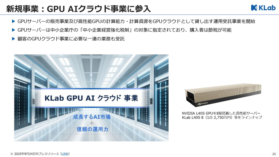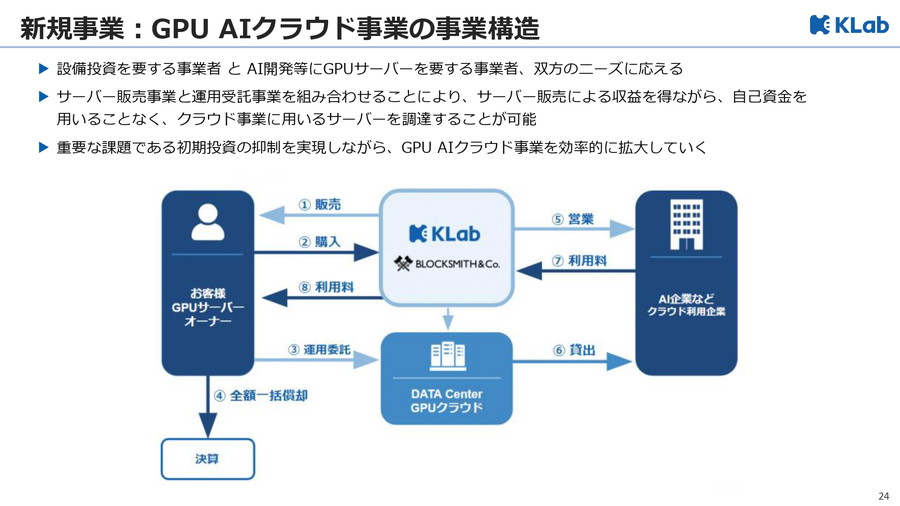 さらに、GPUサーバーの販売・運用受託を組み合わせた GPU AIクラウド事業 に参入した。顧客が購入したGPUサーバーをクラウド基盤として運用し、KLabがその運用を受託することで、販売収益を得ながら自社資金を使わずにサーバー調達を進めるスキームを採用する。