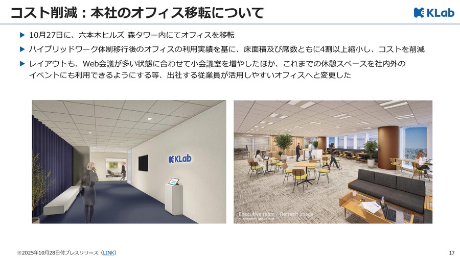 まず、同社は10月27日に六本木ヒルズ森タワー内でのオフィス移転を行った。ハイブリッドワーク体制下でのオフィス利用実績を踏まえ、床面積・座席数ともに4割以上を縮小したという。Web会議に対応した小会議室の増設や、休憩スペースをイベント活用できる仕様に改装するなど、生産性向上も図っている。