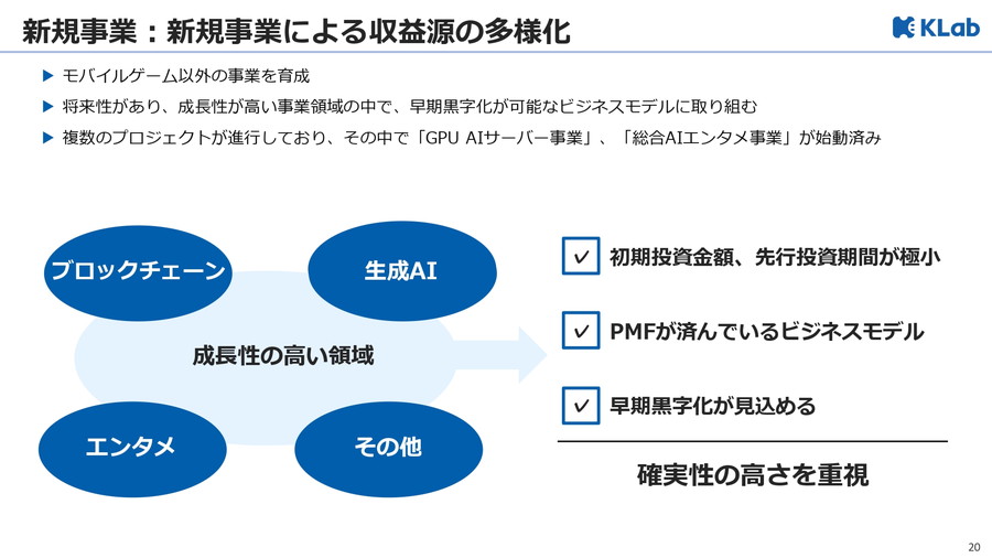 モバイルゲーム依存からの脱却を掲げる同社は、成長性と早期黒字化を両立できる領域として AIエンタメ事業 と GPU・AIクラウド事業 をスタートした。