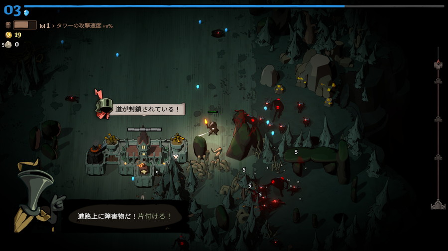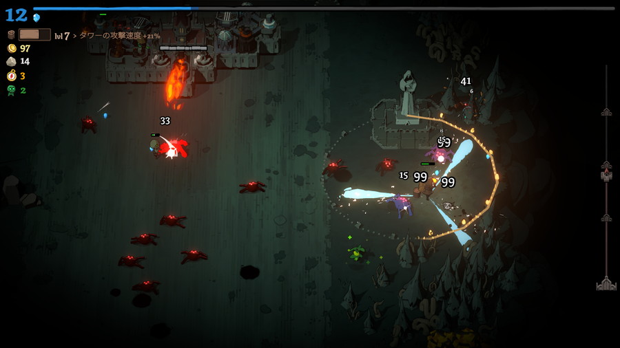 無限に押し寄せるモンスターと戦いながらも、リスクとリターンを考慮し、木材や石、金などの資源を集めていく。豊富な資源を探しに寄り道をするか、安全な避難所を求めて南へ進み続けるかは、プレイヤーの判断に委ねられる。