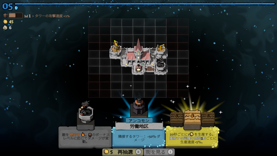 難攻不落の街作りを目指し、「街の中心」を選んでタワーを建設する。敵を迎え撃つ最強のビルドを作り上げ、堅牢な城でモンスターを撃退し、街を前進させ続ける。