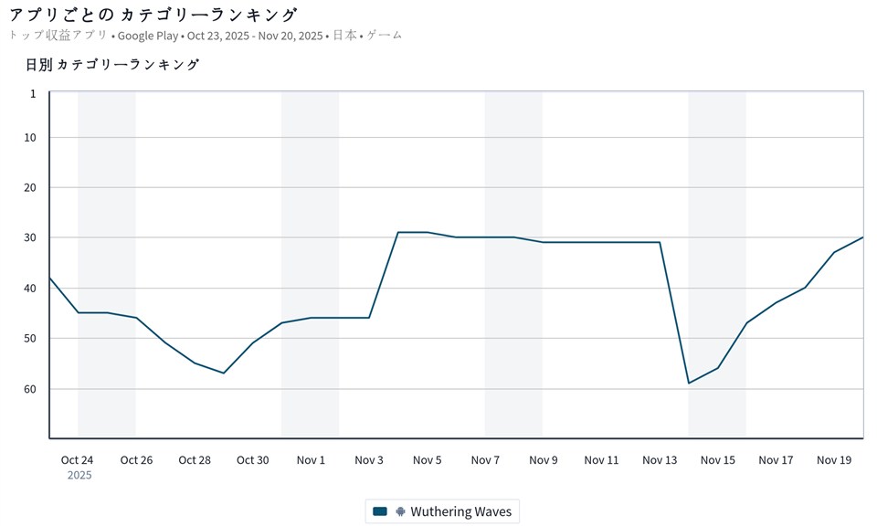 また、KURO GAMESの『鳴潮』が前日の33位から30位に上昇し、トップ30圏内に復帰した。『鳴潮』は、11月20日に大型アップデートVer2.8「琥珀の都へ」の配信を開始しており、新キャラクターの限定星5共鳴者「千咲(チサ)」(CV:金元寿子)と星4共鳴者「卜霊(ボクレイ)」(CV:千本木彩花)の2人が登場していることが足元の順位上昇の原動力となっていくことになりそうだ。
