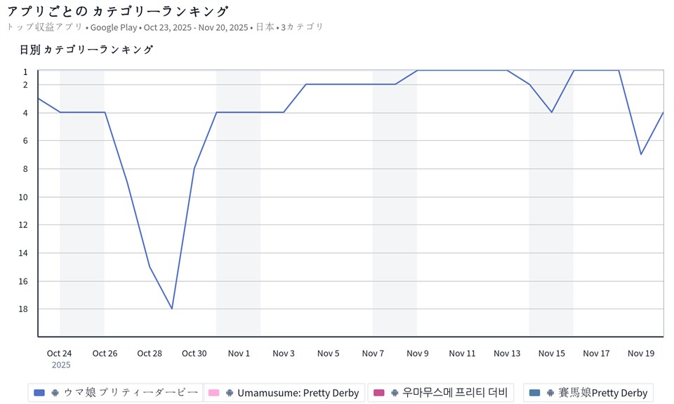 11月18日9時現在のGoogle Playのセールスランキングは、Cygamesの『ウマ娘 プリティーダービー』の首位が続いた。