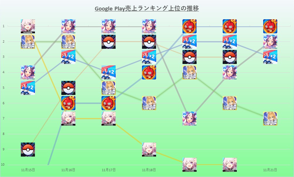 25年11月15日~21日のGoogle Play売上ランキング上位の状況を振り返っていこう。まず、首位獲得タイトルと獲得日スは以下の通り。
