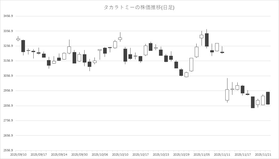 11月25日の東京株式市場では、タカラトミー<7867>が反落。東海東京証券が同社株のレーティング「アウトパフォーム」の継続としたうえで、目標株価を3800円から3810円に引き上げたとの観測が出ている。