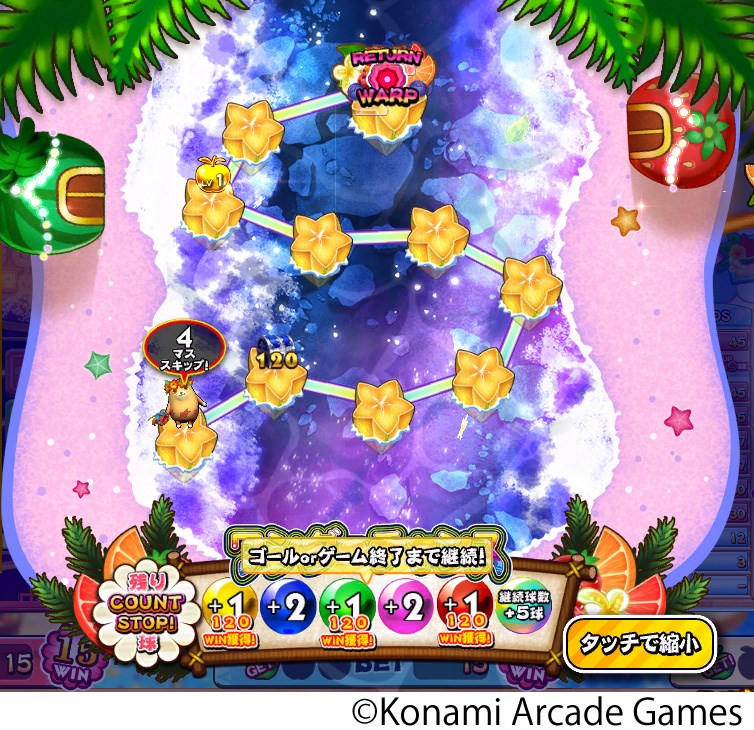 ほかにも、新たに「ゴーゴートレジャー」と「キャンディクランチ」の2種類のゲームが追加され、全14種類のゲームで遊べるようになった。「ワンダーチャンス」や「すごろくチャレンジ」には新要素が加わり、⾊鮮やかなトロピカルリゾートを舞台に、より多彩なゲーム体験を楽しもう。