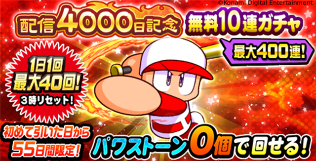 『パワプロアプリ』は11月29日で配信開始から4000日、12月18日には11周年を迎える。これを記念して「配信4000日&11周年キャンペーン」を開催!最大400連の無料10連ガチャを回せるほか、チャレンジ達成で「SR+5⇒PSRチャレンジ券×1」が手に入る「11周年記念チャレンジ」を開催するなど、キャンペーンやイベントが盛りだくさん。