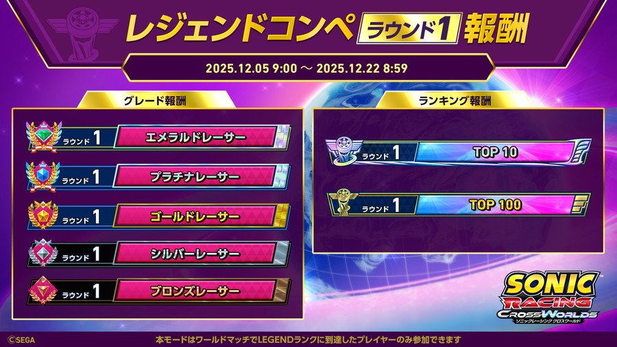 セガは、レーシングゲーム『ソニックレーシング クロスワールド』について、トップレーサーに向けた期間限定のゲーム内イベント「レジェンドコンペ」を12月5日から12月22日まで開催することを決定した。