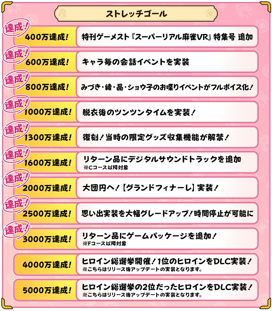 達成された主なストレッチゴールには、特刊ゲーメスト特集号の追加(400万円)、キャラ毎の会話イベント実装(600万円)、主要キャラのお喋りイベントのフルボイス化(800万円)、脱衣後のツンツンタイム実装(1000万円)、復刻限定グッズ収集機能の解禁(1300万円)、リターン品にデジタルサウンドトラックの追加(1600万円)、ヒロインとの関係が一歩進んだエンディングイベント【グランドフィナーレ】の追加(2000万円)、思い出実装の大幅グレードアップ・時間停止機能の追加(2500万円)、ゲームソフト風パッケージの作成(3000万円)がある。未達成のストレッチゴールとして、4000万円、5000万円での歴代キャラクターのDLC追加実装が残されている。