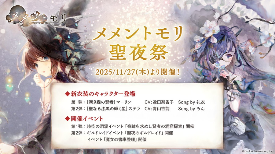 バンク・オブ・イノベーション(BOI)<4393>は、『メメントモリ』においてゲーム内イベント「聖夜祭」を11月27日17時30分より開催すると予告を行った。「聖夜祭」では、新しい装いのキャラクター「マーリン」と「ステラ」が登場する。第1弾として「『深き森の賢者』マーリン」(CV:逢田梨香子/Song by 礼衣)、第2弾として「『聖なる漆黒の輝く星』ステラ」(CV:青山吉能/Song by ろん)がそれぞれ登場する予定。また、新たなメモリーやラメントの追加も行われる。
