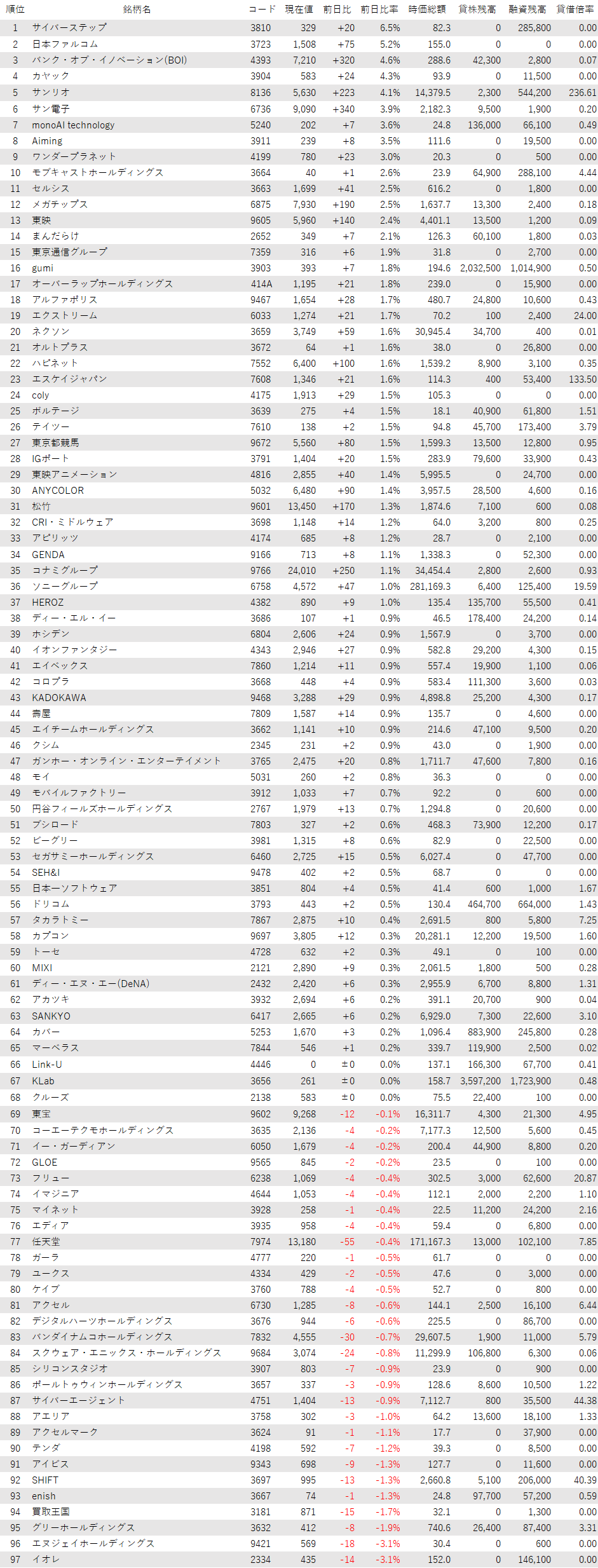 最後に騰落ランキングを見ると、サイバーステップ<3810>や日本ファルコム<3723>、バンク・オブ・イノベーション(BOI)<4393>、カヤック<3904>が値上がり率上位となり、イオレ<2334>、エヌジェイHD<9421>、グリーHD<3632>、買取王国<3181>が値下がり率上位となった。
