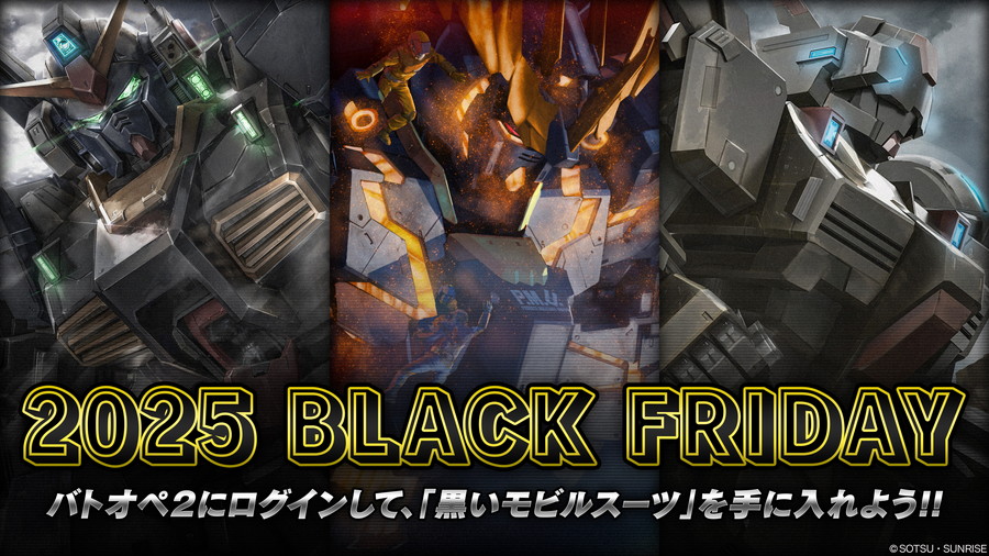 PlayStation®版では「BLACK FRIDAY」キャンペーンも実施中であり、ログインボーナスによる対象MSの配布や、1日1回限定で★2以上のMS1機が確定で手に入るスペシャル抽選配給、期間限定任務(達成でマーク「FAITH」などを獲得)が2025/12/4 13:59まで開催されている。また、同期間中には「【BLACK FRIDAY SALE】お得な31トークンパック」(50%OFF、1アカウント1回限り)も販売されている。カスタムパーツリサイクル交換窓口には「教育型コンピューターLV1」「サイコ・パッケージLv1」が常設で追加された。