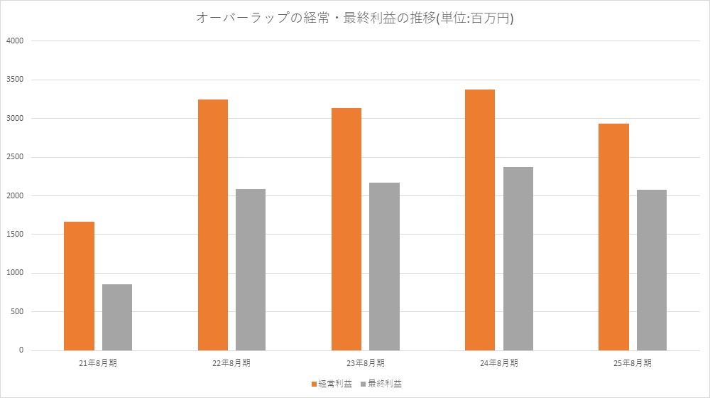 オーバーラップの2025年8月期の決算は、売上高82億9600万円(前の期比1.9%増)、経常利益29億3700万円(同13.0%減)、最終利益20億7800万円(同12.4%減)だった。