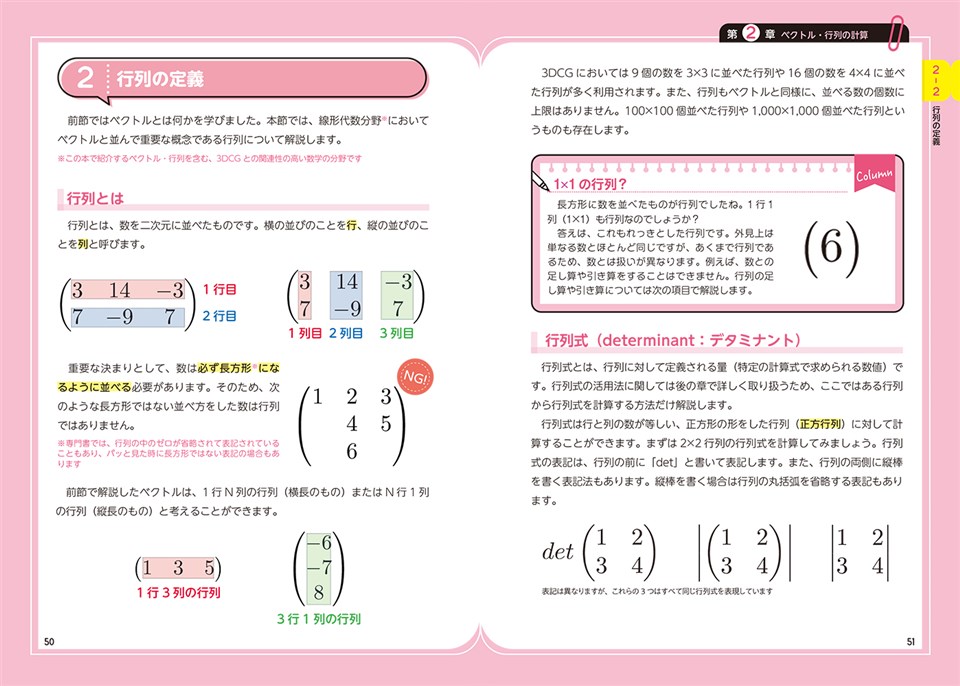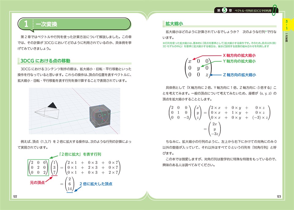 CGを動かしているベクトルや行列について、数学面では足し算・引き算・掛け算・割り算から優しく解説。Blenderを例に、3Dモデルの移動や拡大縮小、ポリゴンの表裏の判定などをどのような計算で動かしているかの解説などを通じ、時にはプログラムの数値をいじって3DCG内でどのような変化が起きるのかを実際に手を動かしてみることで、理解を深める。CG数学のきほんであるベクトル・行列を、そろそろ覚えてみたい方に、読んでほしい一冊となっている。
