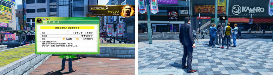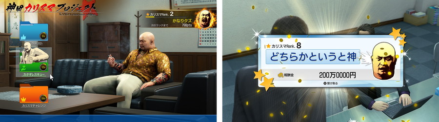多種多様なチャレンジミッションをこなして、神田の評判を上げていくことができる「カリスマチャレンジ」。チャレンジの内容はチンピラの撃破やプレイスポットでの活躍など様々だ。