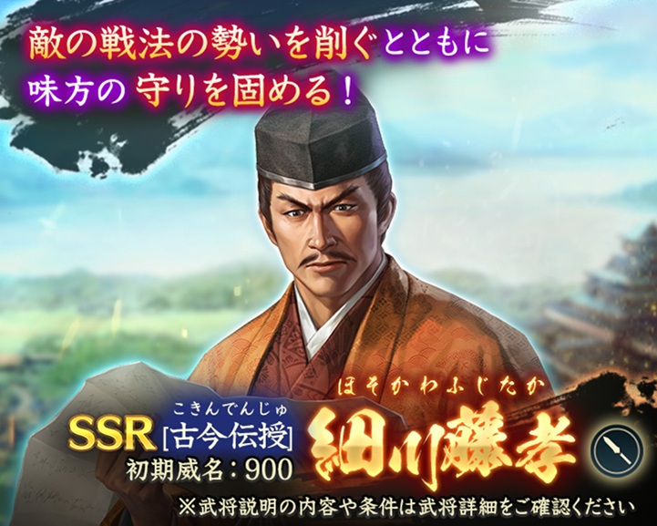 細川藤孝は織田家の足軽武将で、戦法「古今伝授」は自部隊を中心とした大範囲に被ダメージ軽減と継続回復を付与する。