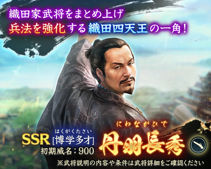 丹羽長秀は織田家の鉄砲武将で、戦法「博学多才」は中範囲の敵部隊に知略攻撃を行い、小範囲の敵部隊の強化状態を打ち消し、自部隊に会心率上昇を付与する。