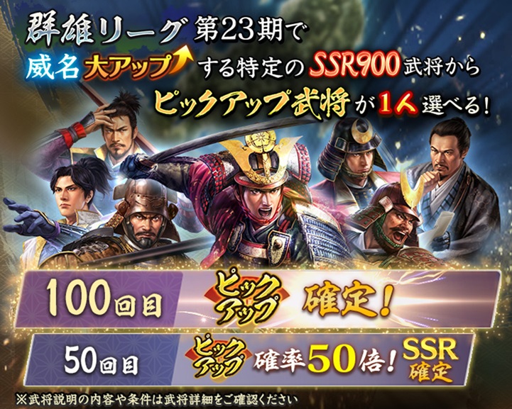 「群雄リーグ 第23期」の参加準備期間が11月27日13:00から12月1日03:59までスタートしている。今回の群雄リーグでは勢力が「織田家」の武将を編成すると、威名アップのボーナスが発生する。対象の織田家のSSR900武将をピックアップ武将として選択できる「特別登用・群雄 第23期」も11月27日13:00から12月25日12:59まで開催されている。