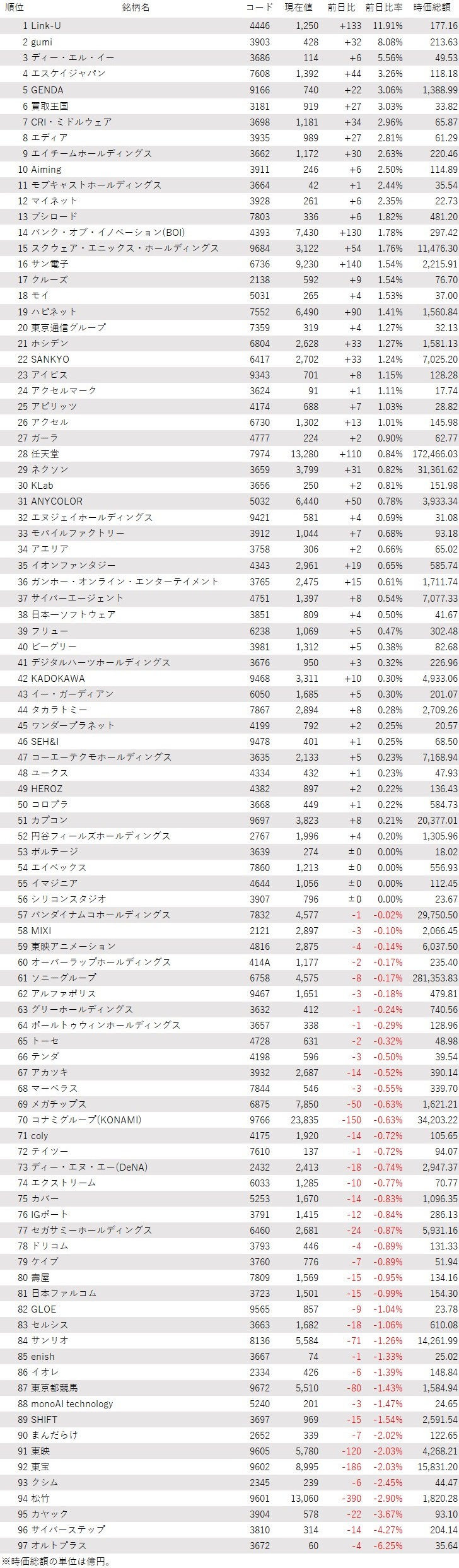 そうした中でゲーム・エンタメ関連株の動きを見てみると、下記の表に登録しているゲーム・エンタメ関連企業97銘柄のうち、上昇は52銘柄(54%)、下落は41銘柄(42%)、変わらずは4銘柄(4%)で、上昇した銘柄のほうが多かった。
