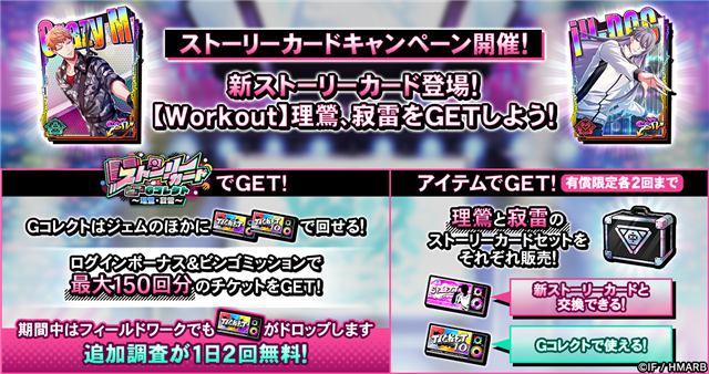 新ストーリーカード「SSR【Workout】毒島メイソン理鶯」と「SSR【Workout】神宮寺寂雷」を獲得することができるGコレクトを開催している。Gコレクトはジェムのほか、専用チケット「ストーリーGコレチケット(vol.3)」各種を使うことでも回すことができ、ビンゴミッションとログインボーナスで最大150回分のチケットを獲得できる。