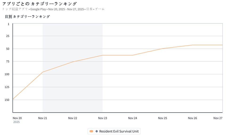 トップ30圏外とはなるが、アニプレックスが11月18日にリリースした新作『BIOHAZARD Survival Unit』が43位までじりじりと順位を上げてきた。本作は、カプコン<9697>の監修・協力のもと、アニプレックスとJOYCITYが共同開発したスマートフォン向けストラテジーゲーム。無料ランキングでも引き続き6位に付けるなど、ユーザーのすそ野を広げており、ここからさらにトップ30圏内を目指す動きとなっていくのか注目される。
