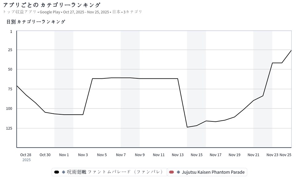 また、サムザップの『呪術廻戦 ファントムパレード』が前日の42位から26位に上昇し、トップ30圏内に復帰した。『ファンパレ』は、11月21日にリリース2周年を迎えたことを記念して、期間限定SSRキャラクターとして「[最大呪力出力]虎杖悠仁」と「[オマエはそれでいいのか?]東堂葵」がガチャに登場していることなどが今回の順位上昇の原動力となっているもよう。