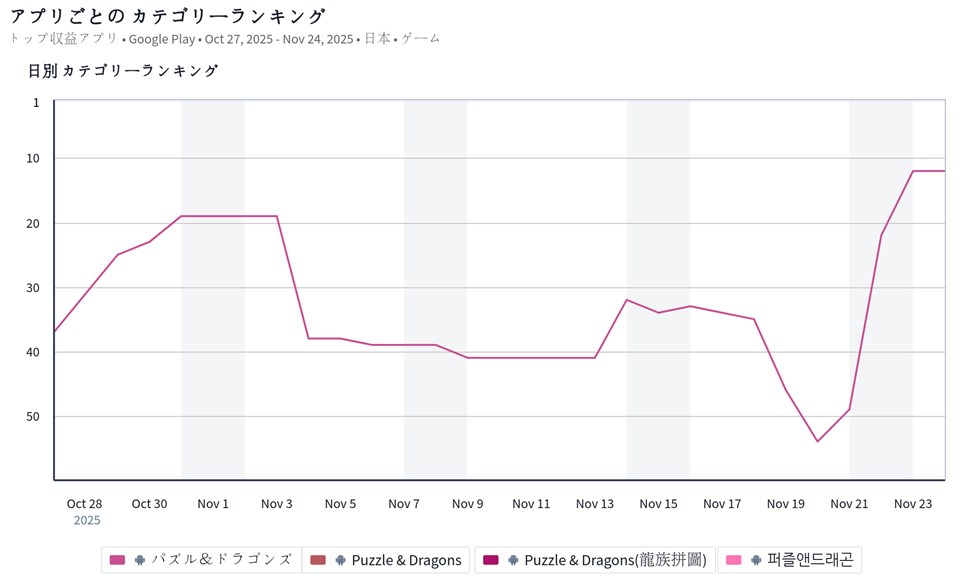 25年11月22日~28日のGoogle Play売上ランキング上位の状況を振り返っていこう。まず、首位獲得タイトルと獲得日スは以下の通り。