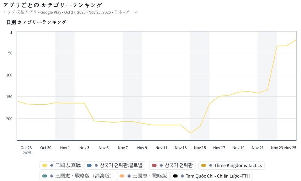 ランキングの動きで目立ったのは、前日の34位から20位に上昇してきたQookkaの『三國志 真戦』だ。『三國志 真戦』は、11月22日より、新PKシーズン「兗州の戦い」を開催しており、新武将として「SP典韋」と「馬岱」が登場していることなどが売上に寄与しているようだ。