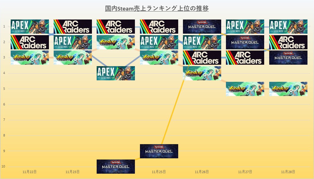 25年11月22日~28日のSteam売上ランキング上位の状況を振り返っていこう。まず、首位獲得タイトルと日数は以下の通り。